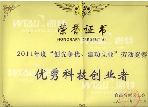 12月20日,我公司總經理聶道靜榮獲2011年度宜昌高新區“創先爭優、建功立業”勞動競賽優秀科技創業者稱號.獲此殊榮是高新區領導對微特公司這么多年艱苦創業的肯定和鼓勵!也為微特自己在下一個十年的發展增強了信心.